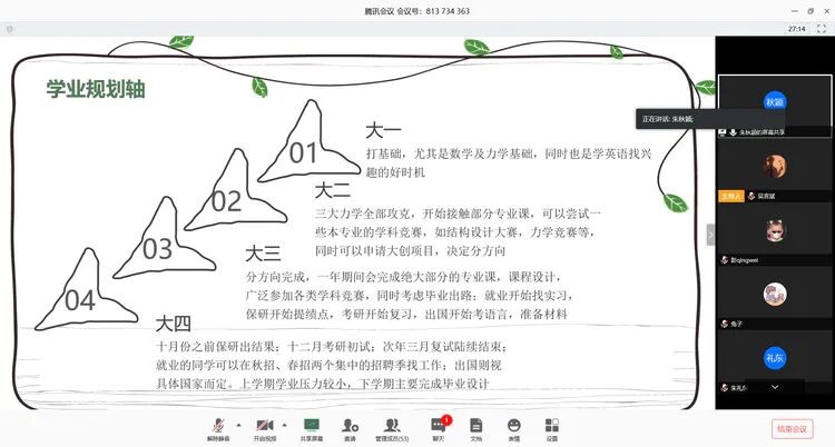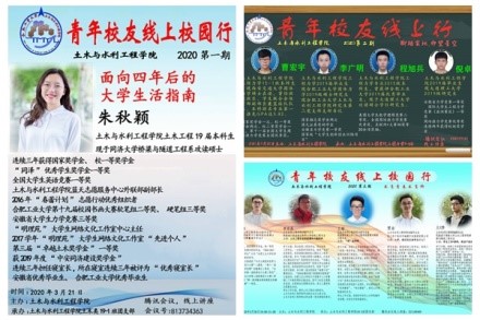 为进一步加强疫情防控期间学生思想政治教育和班风学风建设,丰富学院第二课堂活动体系,充分发挥榜样引领作用,教育引导青年学子向榜样看齐、向榜样学习,3月21日至28日,一品探花 以网为媒,发挥线上实时互动的优势,组织开展了青年校友线上校园行系列活动。活动邀请了现在同济大学、浙江大学、西安交通大学、大连理工大学、中南大学、湖南大学、英国格拉斯哥大学等攻读硕士研究生的青年校友面向2019级学生进行了线上分享交流。