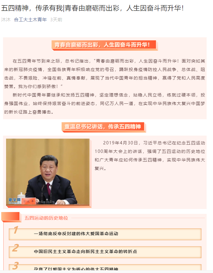 五四精神传承有我,土木青年奋勇争先。为积极响应共青团中央的号召,展现学院青年学子的青春风采,传承和弘扬“五四”精神,唱响青春之歌,学院在全体学生中开展“五四精神,传承有我”主题创作大赛活动。本次活动以“五四精神,传承有我”为主题,以海报、短视频、漫画、原创歌曲、书法、摄影等为载体,充分体现青年抗“疫”的担当作为,大力弘扬新时代“五四”精神,展现广大青年群众共同抗击疫情斗争的故事,生动讲述80后、90后们面对突如其来的病魔会“脱去靓丽的衣服,扔下昂贵的皮包”“毫不迟疑地投入战斗”的英雄故事,展现广大青年不畏艰险、勇挑重担、积极向上、奋发有为的精神面貌。