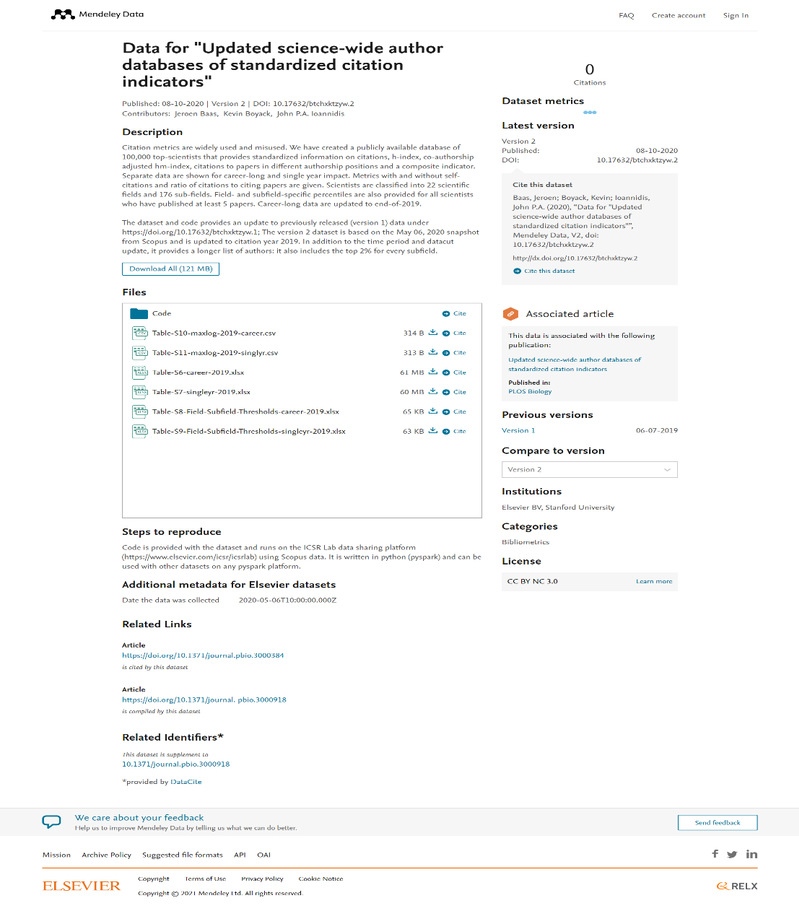 World’s Top 2% Scientists 2020榜单由斯坦福大学Jhon P. A. Loannidis教授团队与Elsevier旗下Mendeley Data发布。榜单以Scopus数据库为依据,基于引用次数、h因子、hm因子等6种综合指标,分22个领域和176个子领域,从近700万名科学家中遴选出世界排名前2%的科学家。