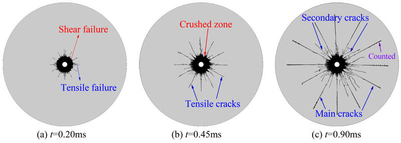 为了使两种本构模型具有可比性,本研究基于同一组花岗岩试样的试验数据,确定了两种本构的模型参数。在单次爆破模拟中,RHT模型能较好地描述炮孔附近粉碎区的形成和远端径向拉伸裂纹的扩展,并且其模拟结果与理论和试验结果吻合较好。而HJC模型的损伤云图仅能表征粉碎区的形成而无法描述径向裂纹的演化(图1)。为此,本工作对HJC模型进行了改进,引入了“最大拉应力+最大剪应变”的复合失效准则,使其能较好地模拟出单次爆破的裂纹扩展过程(图2)。