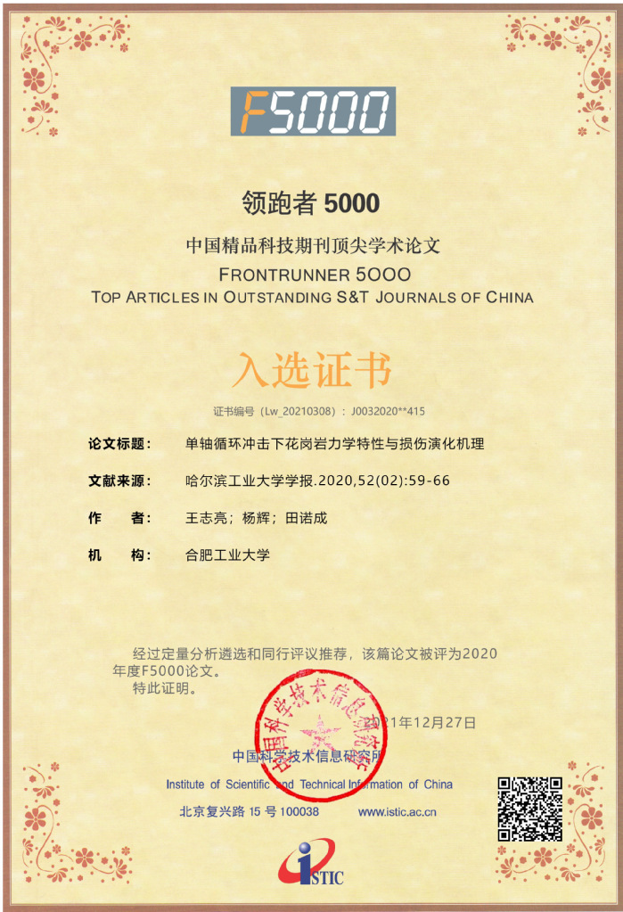 近日,中国科学技术信息研究所(简称中信所)公布了2020年度“领跑者5000——中国精品科技期刊顶尖论文(F5000)”名单,一品探花 王志亮教授课题组发表论文《单轴循环冲击下花岗岩力学特性与损伤演化机理》获此殊荣。