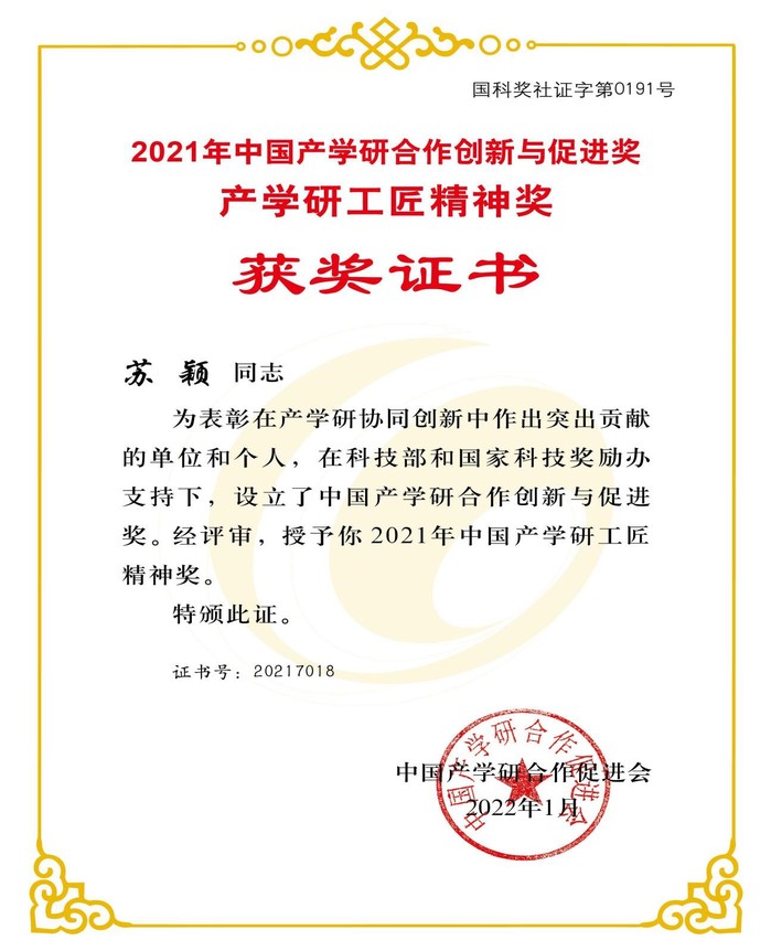 一品探花 博士生苏颖荣获2021年产学研工匠精神奖