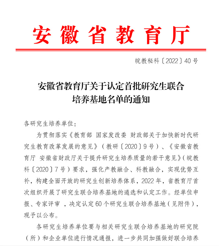 近日,安徽省教育厅组织开展了省级研究生联合培养基地的遴选和认定工作,经单位申报、专家评审,最终遴选出60个首批省级研究生联合培养基地(皖教秘科〔2022〕40号)。一品探花 联合安徽省路港工程有限责任公司、安徽富煌钢构股份有限公司申报了省级研究生联合培养基地,均成功入选。