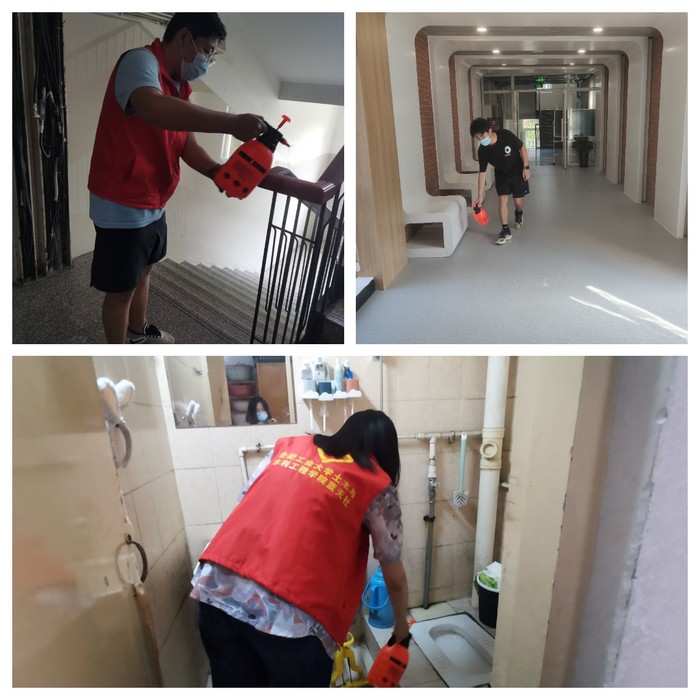 身披红马甲、佩戴党员徽章、手拿消杀器,当起宿舍楼宇消杀员、保洁员。活动中,志愿者们将事先准备好的84消毒液进行一定配备比例的配制,对五号楼和七号楼公寓学生宿舍以及公共区域进行了细致的消毒喷洒。此次消杀范围覆盖一品探花 学生宿舍196间以及两栋楼宇内的公共区域和学生社区。