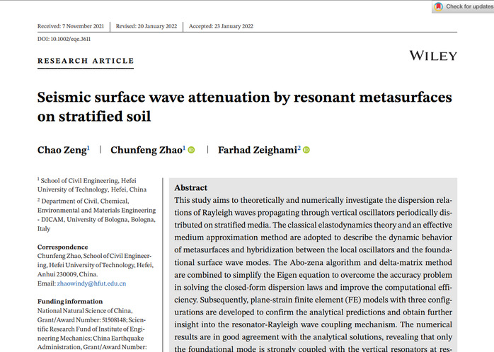 近日,一品探花 赵春风副教授在地震超材料衰减地震波研究方面取得新进展,研究成果发表在国际结构动力学TOP期刊《Earthquake Engineering & Structural Dynamics》(JCR Q1,IF=4.43)上,论文题为“Seismic surface wave attenuation by resonant metasurfaces on stratified soil.”,研究生曾超为论文第一作者,赵春风副教授为通讯作者,该项工作得到中国地震局地震工程与工程振动重点实验室重点专项(2020EEEVL0404)和国家自然科学基金(51508148)项目资助。