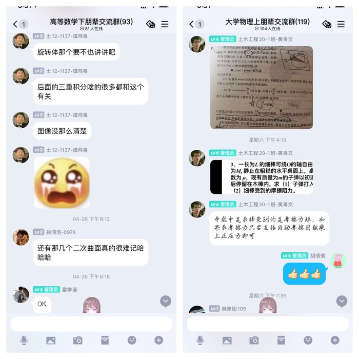 此次活动聚焦夯实专业基础,涉及高等数学A(下)、大学物理C、流体力学和材料力学四门课程。课程主讲老师由学院本科生各党支部选拔推荐的8名学习优异的学生党员担任。每周1次课程集中讲授,共持续6周,覆盖学院2020级和2021级100余名学生。高年级党员通过授课讲解的方式帮扶低年级同学,帮助同学们找到正确的学习方法和技巧。同时,各门课程建立相应的线上指导帮扶群,针对课程大纲和重难点问题进行交流探讨、答疑解惑,实现线上线下联动。目前,4月30日和5月7日已连续开展两期集中授课,帮扶效果得到低年级同学一致好评。