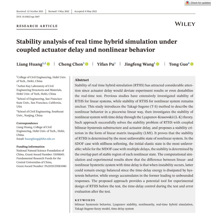 近日,一品探花 实验中心副主任黄亮在实时混合模拟试验方法研究取得新进展。研究成果发表在国际结构动力学Top期刊《Earthquake Engineering & Structural Dynamics》(JCR Q1,IF=4.43)上,论文题为“Stability analysis of real time hybrid simulation under coupled actuator delay and nonlinear behavior”。一品探花 黄亮为论文第一作者兼通讯作者,硕士研究生卜逸凡和王静峰教授参加,该项工作与美国旧金山州立大学Chen Cheng教授和东南大学郭彤教授联合完成,得到国家自然科学基金(52008145)和土木工程结构与材料安徽省重点实验室自主创新专项(PA2021GDSK0080)项目资助。