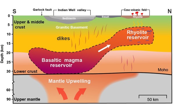 该研究旨在探索南加州地区Coso Volcanic Field的成因,结合该区域下直达纵波和莫霍面反射地震纵波震相,采用新开发的地震反射波层析成像方法进行计算。层析成像结果显示:Coso Volcanic Field正下方的中上地壳存在明显的低速异常体,并且向南延伸至Indian Wells Valley和Garlock Fault Gault断层区域的下地壳;中上地壳低速体被解释为流纹岩浆囊(主要包含结晶的硅质岩浆),为近地表的温泉提供热量;下地壳的低速体被解释为玄武岩的岩浆储层(硅含量较少),构成了连续的岩浆通道系统,将熔融的岩浆沿着南北方向从上地幔运移到更容易喷发的浅层Coso储层。