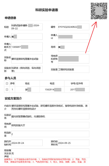 (4)试验过程中,【指尖工大App】扫码科研实验申请表二维码,记录【科研实验台账】。试验进场、试验撤场、场地面积丈量、安全卫生等关键节点情况必须记录实验台账。