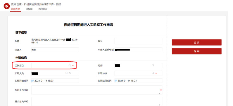关联科研试验申请项目,填写申请信息,提交加班申请。每次加班申请时间最长不超过一个学期或一个寒/暑假。
