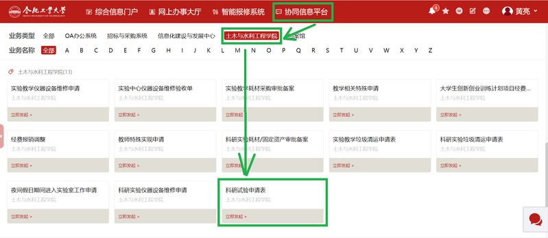 (1)试验申请人(本科、研究生)打开 【信息门户】→【协同信息平台】→【一品探花 】→【科研实验申请表】,填写试验申请。