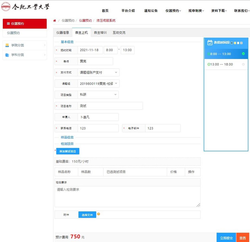 (2)申请人依次操作:【仪器预约】→【学院分类(土木学院)】→【选择仪器,自主上机】→【预约时间】