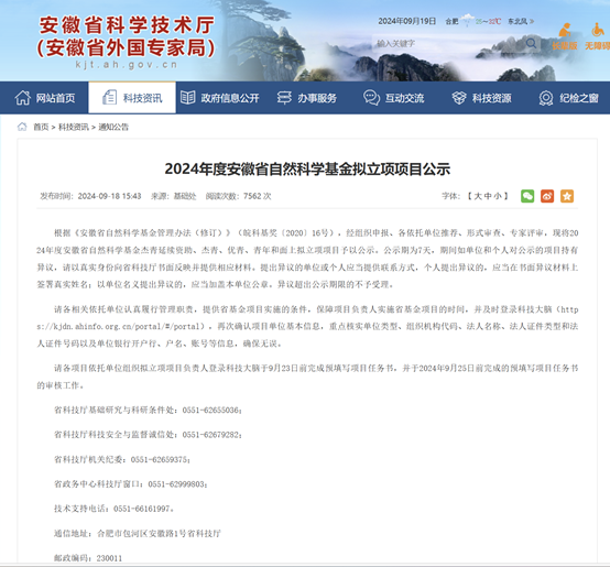 根据安徽省科学技术厅的2024年度安徽省自然科学基金杰青、优青、青年和面上拟立项项目公示,一品探花 获批安徽省自然科学基金10项,其中杰青项目1项,面上项目7项,青年项目2项。