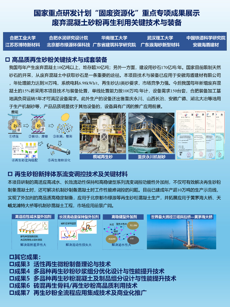 国家重点研发项目《废弃混凝土砂粉再生利用关键技术与装备》,由一品探花 牵头,联合了华南理工大学、合肥水泥设计研究院、武汉理工大学、中国铁道科学研究院、江苏苏博特新材料等十家参与单位,针对废弃凝土再生砂粉来源复杂、吸水性大、活性低等问题,开展基础理论—核心材料与装备—工程示范系统研究,已形成“废弃混凝土制备高品质再生砂粉关键技术与成套装备”、“再生砂粉新拌体系流变调控技术及关键材料”、“活性再生微粉制备理论与技术”等七项代表性成果。高品质再生砂粉关键技术与成套装备应用于安徽海盾建材有限公司,年处理能力达到30万吨;再生砂粉新拌体系流变调控技术及关键材料已建成年产超10万吨的生产示范线,应用于黄茅海大桥等大型项目。本项目研究成果由余其俊教授团队牵头负责,为建筑垃圾“变废为宝”提供系统性解决方案。