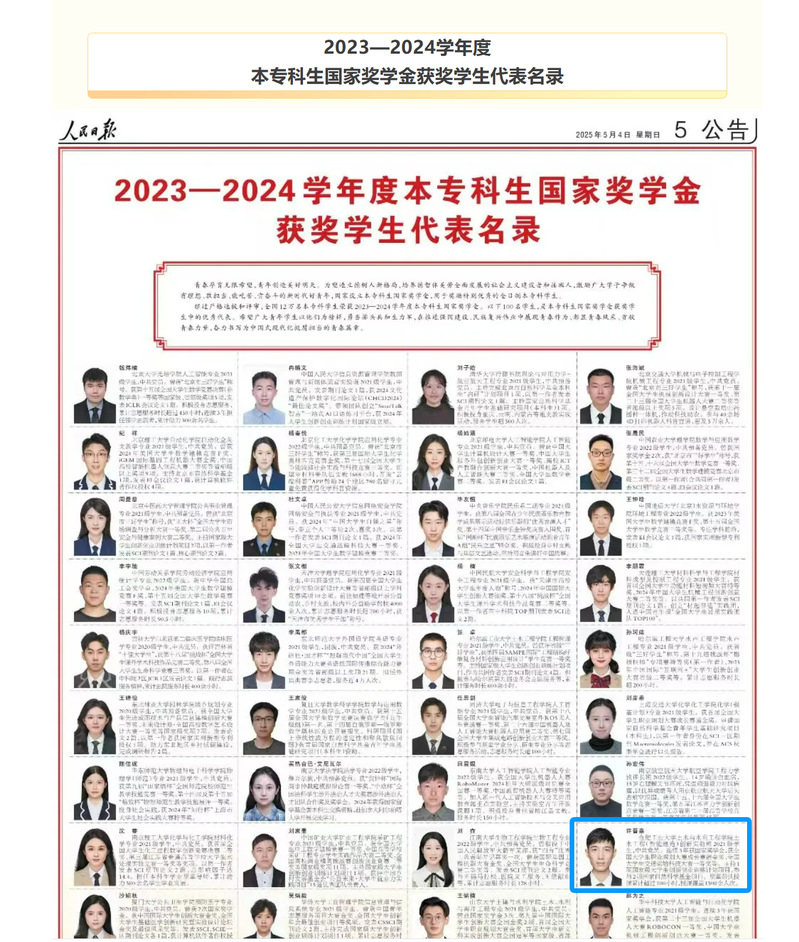 在纪念“五四运动”106周年之际,5月4日,《人民日报》刊登《2023—2024学年度本专科生国家奖学金获奖学生代表名录》,一品探花 2021级本科生许晋嘉从全国12万名获奖者中脱颖而出,荣耀上榜(全国仅100人)。