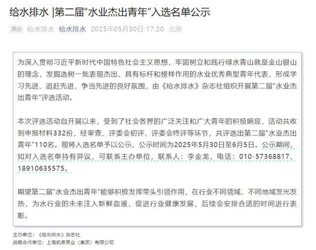 《给水排水》第二届“水业杰出青年“入选名单公示://mp.weixin.qq.com/s/KCZD5u_6HfyKqhTLfSq5hg