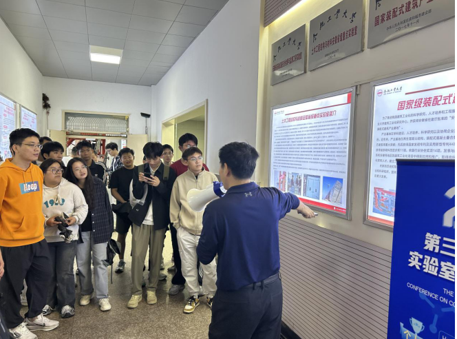 同日下午,学院组织2025级全体研究生新生参观结构实验室。活动特邀周平老师讲解,帮助新生快速熟悉科研环境。周平首先介绍了实验室的整体布局及其在科研与教学中的定位,随后带领新生逐一参观液压伺服加载系统、万能试验机、振动台等核心设备,并结合演示详细拆解结构静力加载全过程——从试件的精准安装、荷载的逐级施加,到应变数据的实时采集。以混凝土梁为例,他展示了材料从弹性变形直至极限破坏的完整过程。