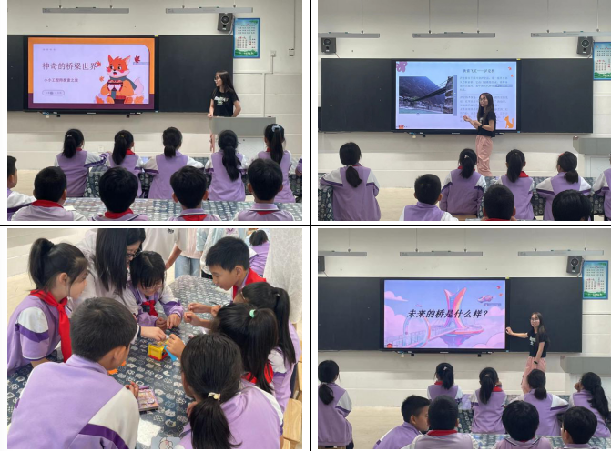 王贝贝从认识身边的桥引入,引导学生分享日常生活中所见桥梁的类型与特点,逐步解析桥墩、桥面、拱肋等关键结构的工作原理。通过云游览赵州桥与金门大桥,她向同学们展示了跨越时空的工程智慧。郑紫玲现场演示纸桥承重实验,将普通A4纸折叠后承载多本课本,生动展现结构力学原理,激发了同学们的动手实践兴趣。