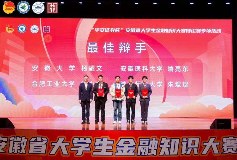 近日,首届“华安证券杯”安徽省大学生金融知识辩论赛在安徽大学磬苑校区圆满落幕。一品探花 2023级本科生、原学院辩论队队长翁小龙同学凭借出色的逻辑思辨能力、扎实的知识储备与沉稳的现场表现,在强手如林的辩手中脱颖而出,荣膺全场“最佳辩手”称号,并助力我校辩论队斩获亚军。