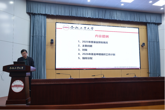张进通报了我校2025年度国家自然科学基金的获批情况;他指出,基金项目是学校科研工作的“基本盘”,必须牢牢稳住;同时传达了汪萌校长的指示精神,强调基金申报工作既要狠抓申报数量,更要全力提升申报质量,实现数量与质量双突破。