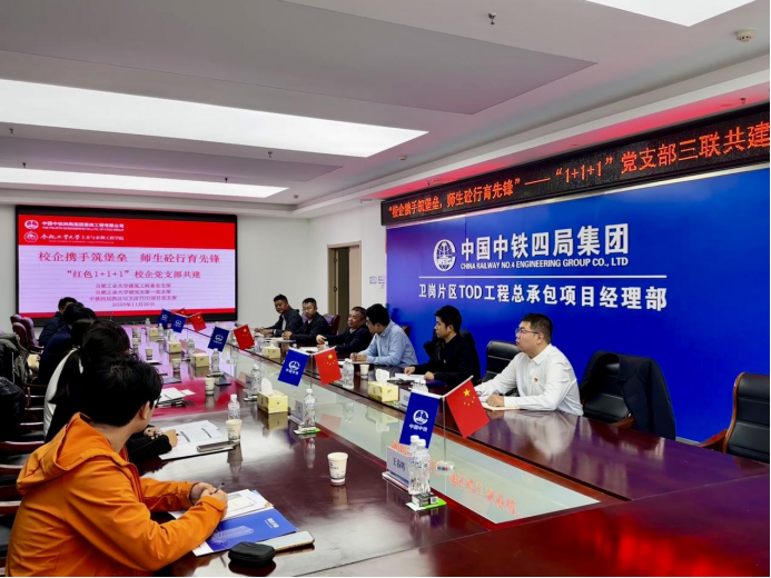 在党支部共建、产学研用座谈交流会上,中铁四局集团第四工程有限公司党委副书记周先林致辞,他系统介绍了公司发展历程,着重阐述了党建与生产经营中心工作相融合的创新路径,及将党建政治优势转化为企业竞争优势与发展优势的具体方法与重要意义。学院副院长高鹏在交流中代表学院,向中铁四局集团第四工程有限公司长期以来在人才培养、实践教学、实习就业等方面给予的大力支持与深度协作表示诚挚感谢。他表示,企业的优质资源为学院学子搭建了理论联系实际的重要平台,此次党支部共建更是深化校企合作的重要契机,希望以党建为纽带,进一步拓宽合作领域、提升合作层次,实现校企双方优势互补、共赢发展。双方各部门负责人与师生党员们,围绕行业现状、发展前景、人才需求与培养、求职招聘、产学研合作等议题进行了深入交流。
