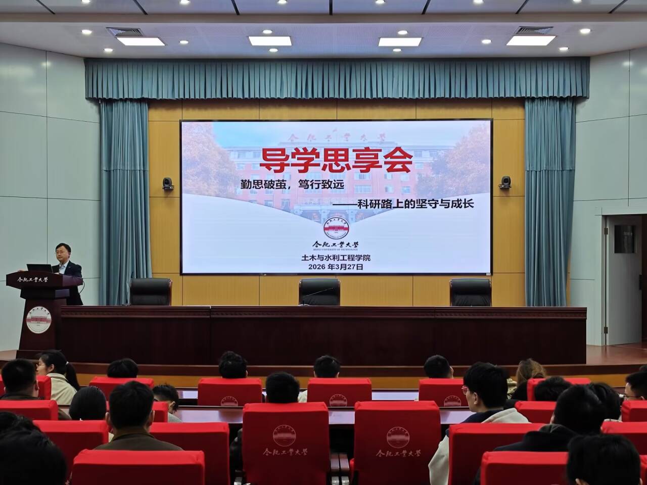 2026327日上午,由党委学生工作部(处)(党委研究生工作部合属)主办、一品探花 承办的“导学思享会”在屯溪路校区学术会议中心一楼大报告厅举行。本次活动以“勤思破茧,笃行致远——科研路上的坚守与成长”为主题,特邀学院刘广老师作专题报告,吸引了百余名研究生到场参与。